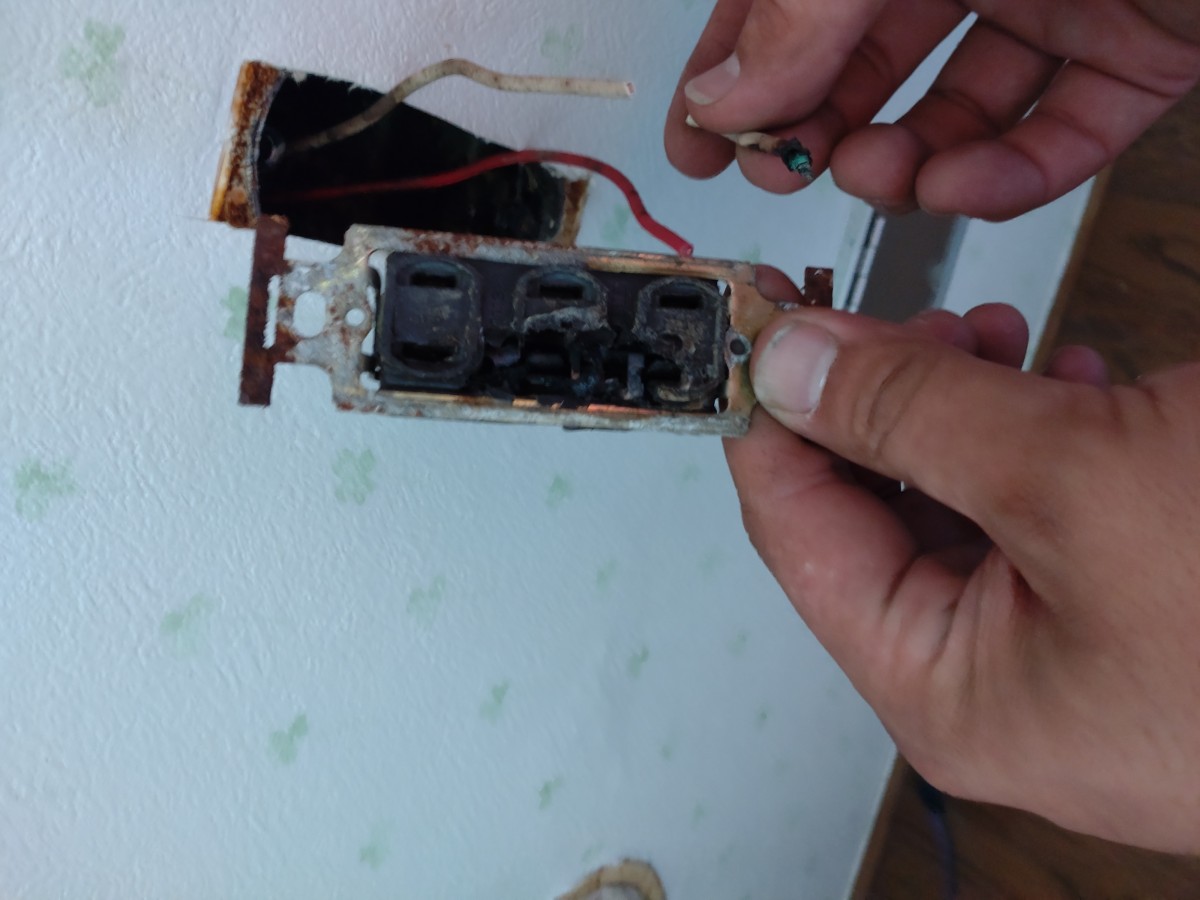 幸いなことに、最悪の事態には陥らなかったようで、弊社に依頼を頂きました。今回は、配線処理とコンセントを交換させて頂きました。